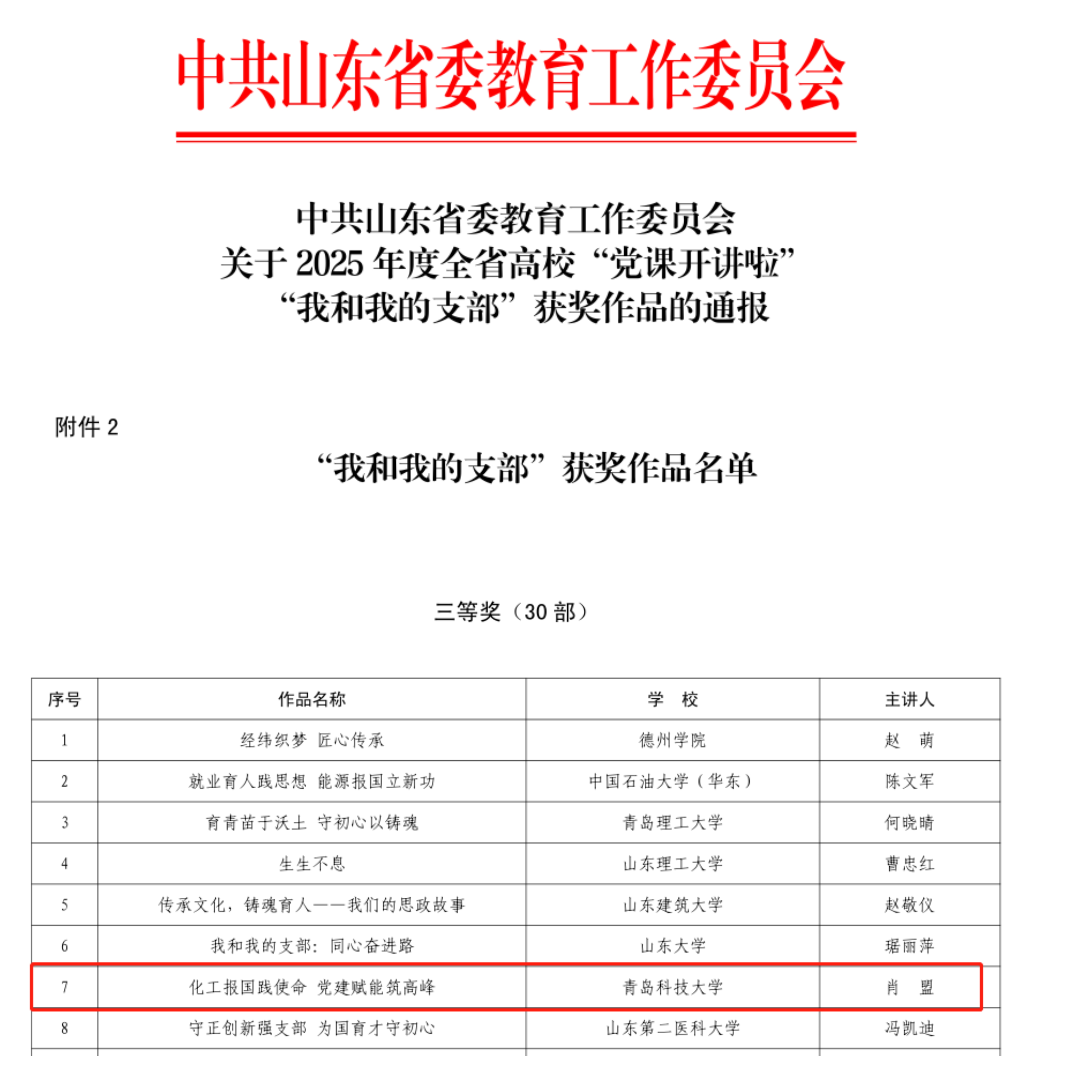 据悉,中共山东省委教育工作委员会《关于做好2025年度全省高校“党课开讲啦”“我和我的支部”申报工作通知》下发后,各高校精心组织创作,积极遴选推荐,经学校申报、专家评审、集体研究、结果公示,评选出“党课开讲啦”优秀作品60部、“我和我的支部”优秀作品60部。