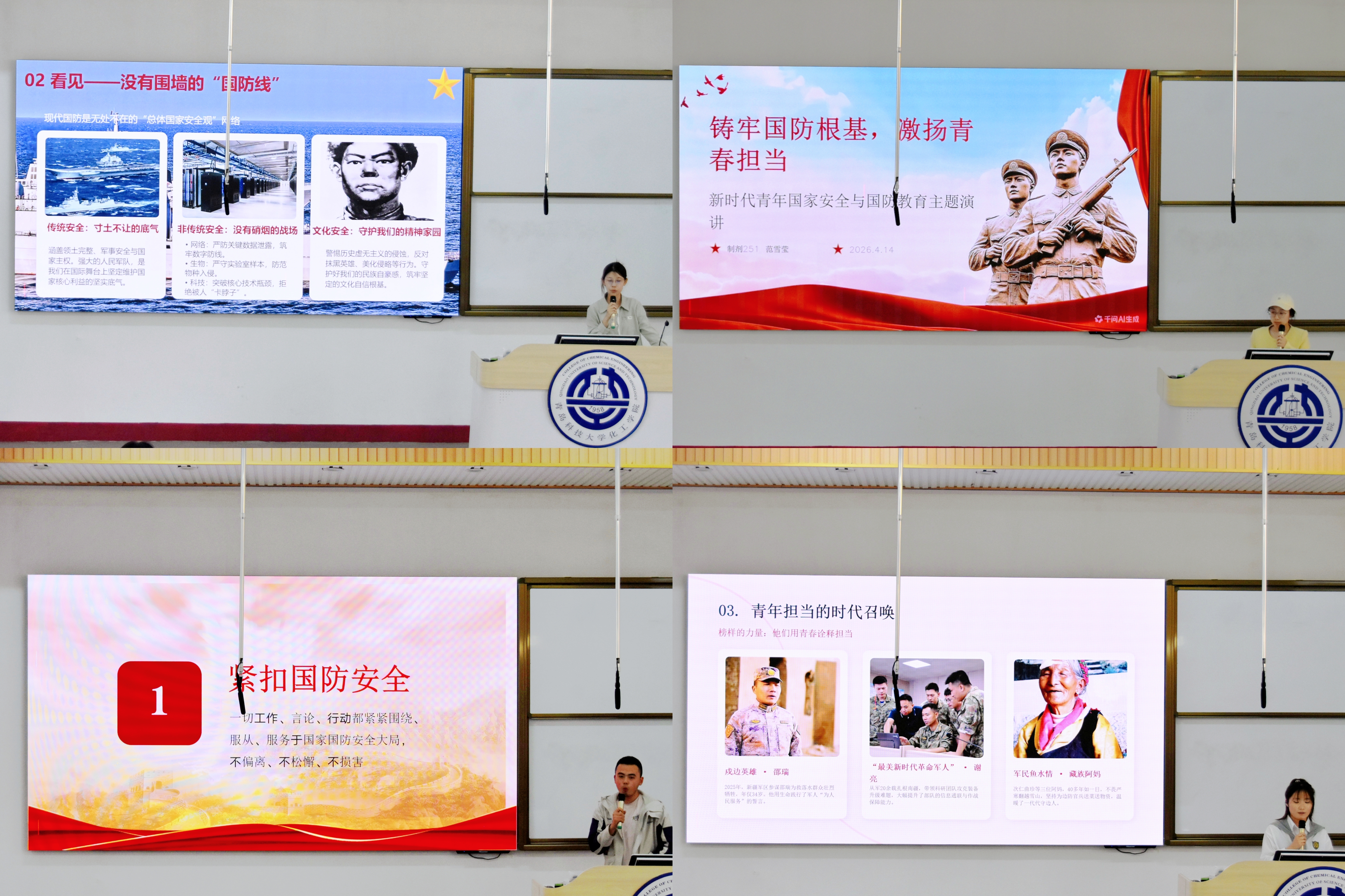 为深入贯彻落实总体国家安全观,强化新时代青年国防教育,厚植家国情怀与使命担当,4月14日下午两点,化工学院学生会办公室面向24级、25级全体学生,在第二教学楼101教室举办“铸牢国防根基,激扬青春担当”国防安全主题演讲比赛。