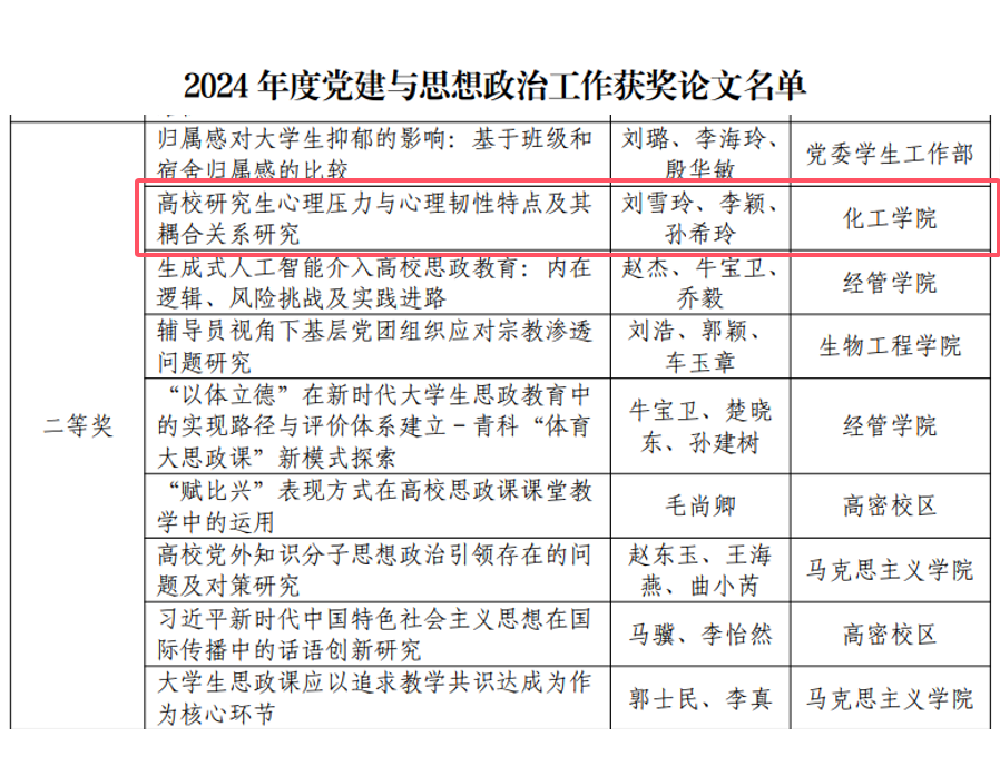 化工学院柳晓阳等申报的《打造“融媒体+思政育人”体系,让“正能 量”收获“大流量”》获一等奖。刘雪玲等申报的《高校研究生心理压力与心理韧性特点及其耦合关系研究》获二等奖。