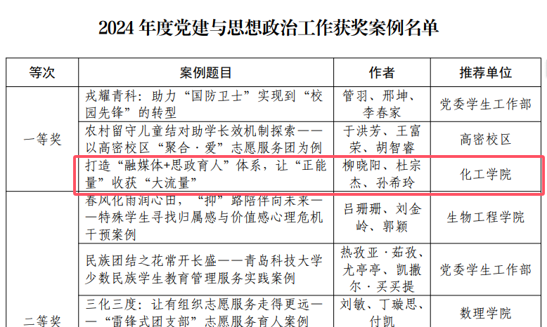 近日,学校公布《关于表彰2024年度党建与思想政治工作获奖优秀论文(案例)的通知》,化工学院共有2项论文(案例)获奖,其中一等奖1项、二等奖1项。