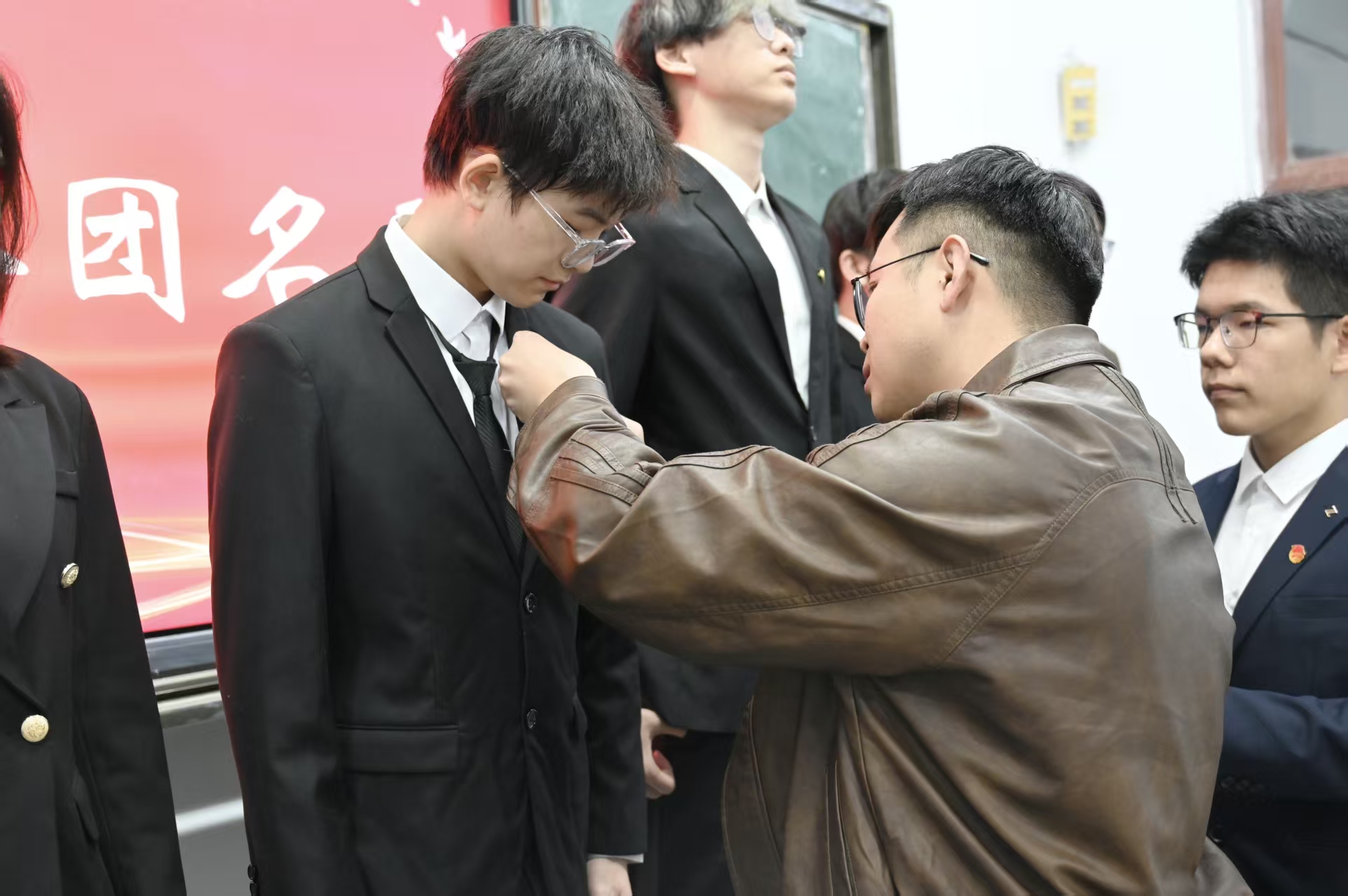 柳晓阳为新发展团员代表佩戴团徽,并向新团员表示欢迎与祝贺。他强调了共青团员肩负的职责与使命,并对各位团员提出殷切期盼,希望大家要以团员标准严格要求自己,努力做追求进步的青年模范、本领过硬的青年先锋、作风扎实的青年表率、矢志奋斗的青年力量。