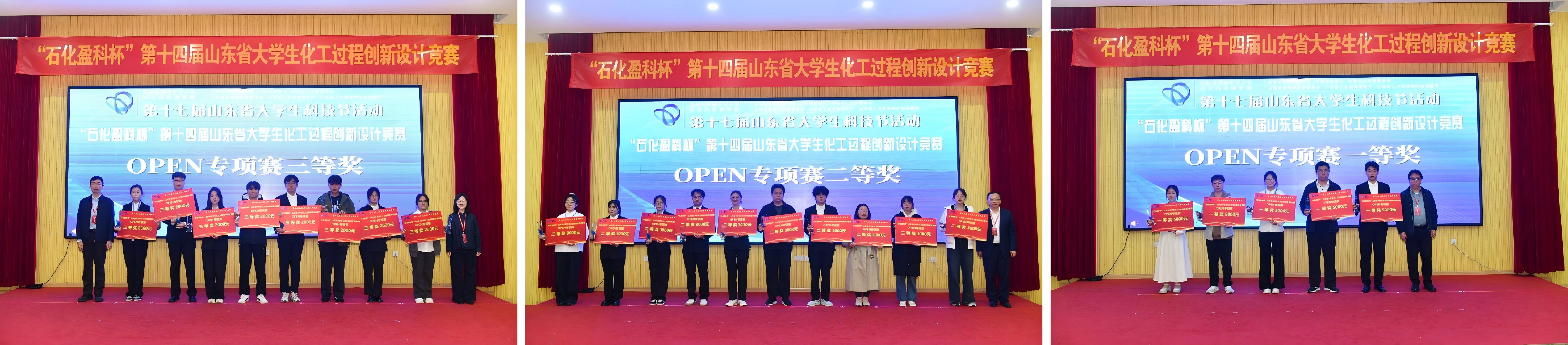 丁林、李艳东为一等奖团队颁奖,化工学院院长李金恒、中国海洋大学化学化工学院副院长夏树伟、山东科技大学化学与生物工程学院副院长高军、聊城大学化学化工学院袁青为二等奖团队颁奖。中石化科技部及石化盈科公司代表王乐、王建平、陈玉石、雷曼分别为石化盈科OPEN专项赛获奖团队颁奖。
