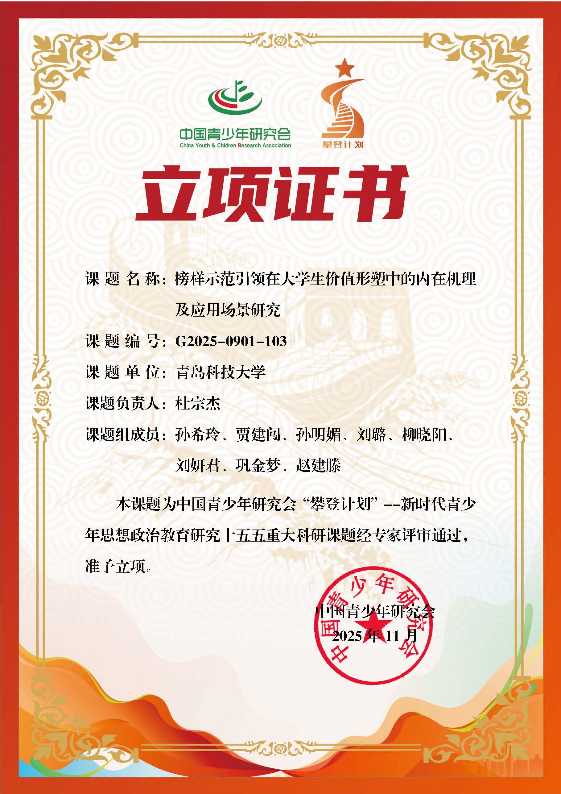 11月19日-23日,由中国青少年研究会组织“攀登计划”--新时代青少年思想政治教育研究暨“十五五”开题立项培训会在上海市召开。会议上公布了“攀登计划”--新时代青少年思想政治教育研究“十五五”重大科研课题经立项名单,化工学院杜宗杰申报的《榜样示范引领在大学生价值形塑中的内在机理及应用场景研究》获批立项。