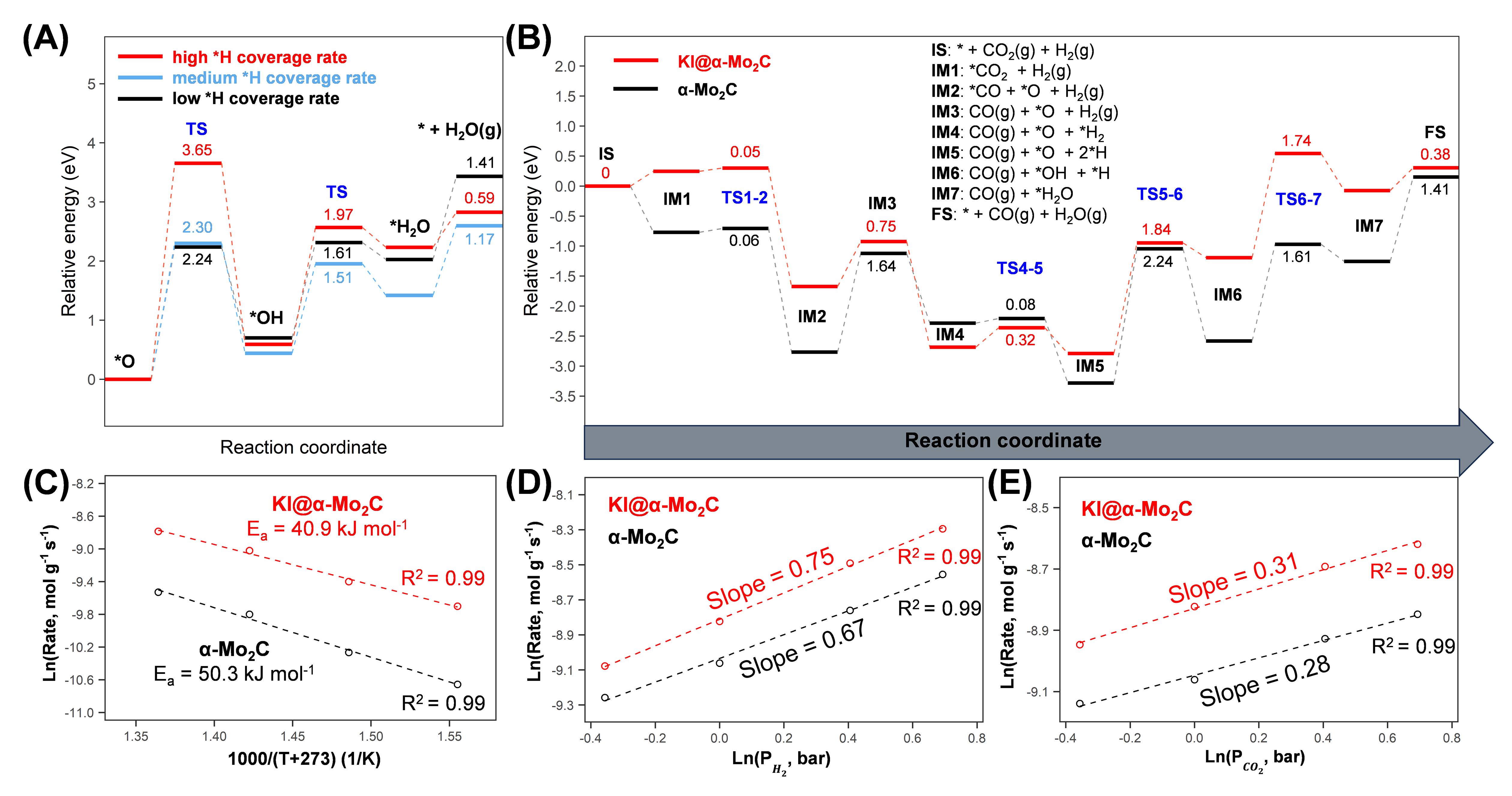 课题组首次将KI掺杂进α-Mo2C合成了KI@α-Mo2C,实现了非贵金属催化剂在400-700°C和1-4 bar反应条件范围内接近热力学平衡的CO收率和100%的CO选择性。特别是在气时空速为36,000 mL g-1h-1的情况下,KI@α-Mo2C在400°C和4 bar条件下,实现了超过1000小时接近0.95 CO平衡收率的超高稳定性。