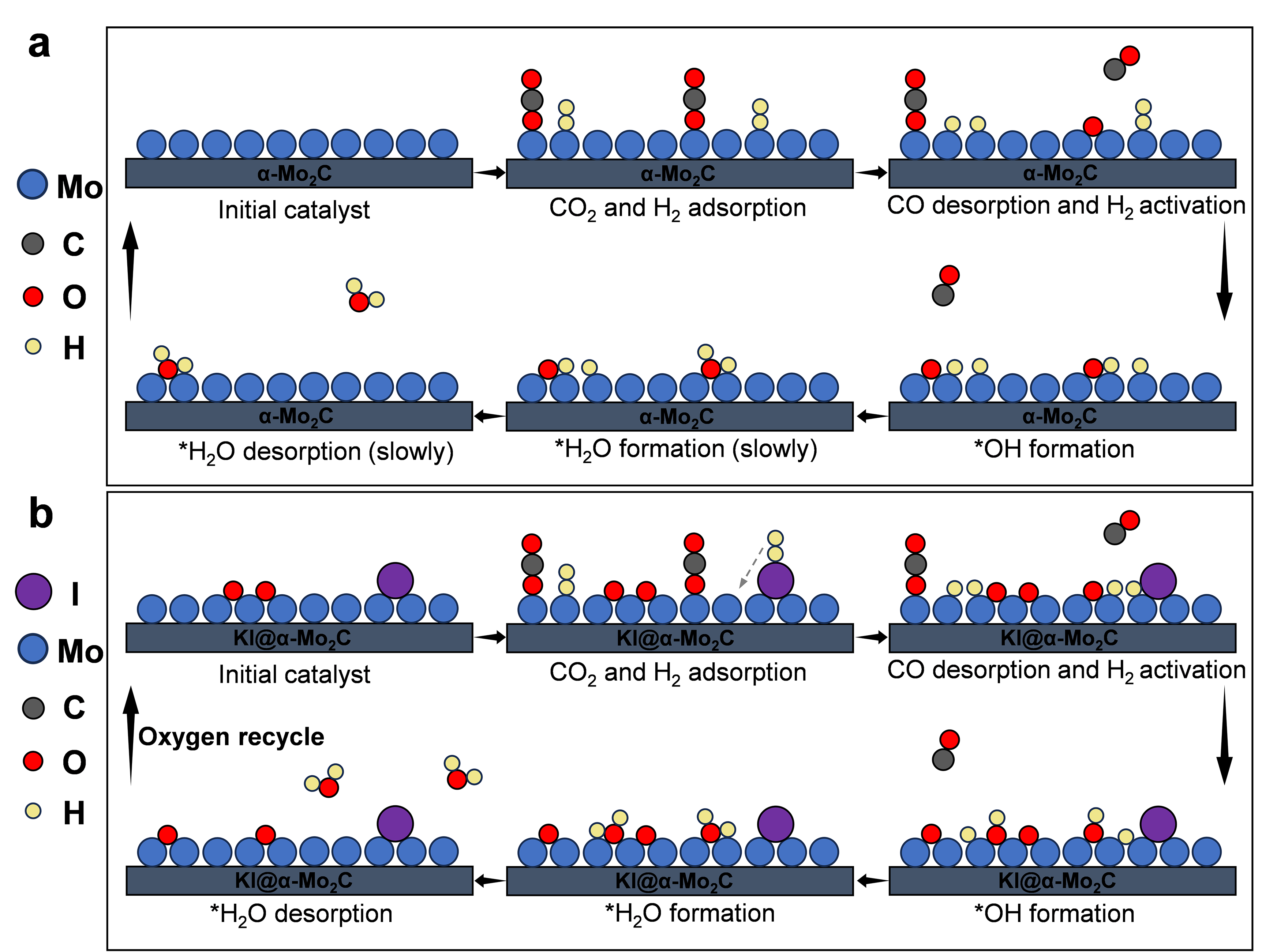 通过SEM, XRD, XPS, BET, in situ DRIFTS, in situ TGA,球差电镜,同步辐射以及δ18O同位素含量分析等表征方法证明,掺杂的I元素有效地增强了α-Mo2C活化H2的能力,从而提高其CO2转化率。而K元素的掺杂则稳定了更多表面非晶态氧(作为“氧银行”)在α-Mo2C上,有效抑制了甲烷化副反应,实现催化剂在400°C和4 bar条件下接近热力学平衡的CO收率。