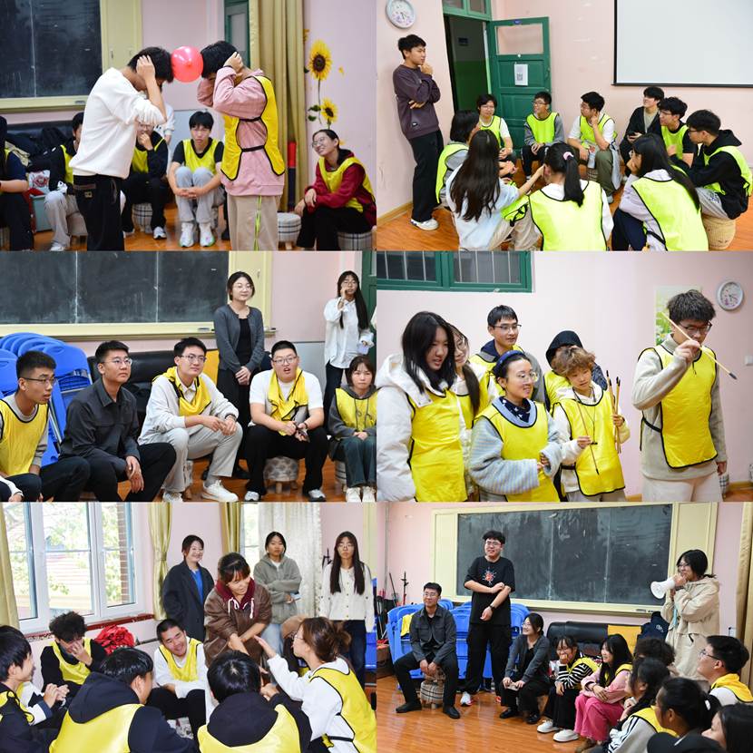活动期间,各班同学在心理中心团体辅导室参与了“独一无二的我们”“蒙眼抓人”“你比划我猜”“方言传话”“投壶”“抢凳子”“萝卜蹲”等系列团体活动。活动以轻松的互动开场,引导新生在交流中自我介绍、相互了解,逐步消除初入大学的陌生感与距离感。随后,师生共同参与各项团队协作游戏。老师不仅担任引导者和协调者,也在活动中与学生互动,现场气氛热烈而有序。学生们在互动与协作中展现出青春活力与创造力,同时深化了师生间的信任与理解。